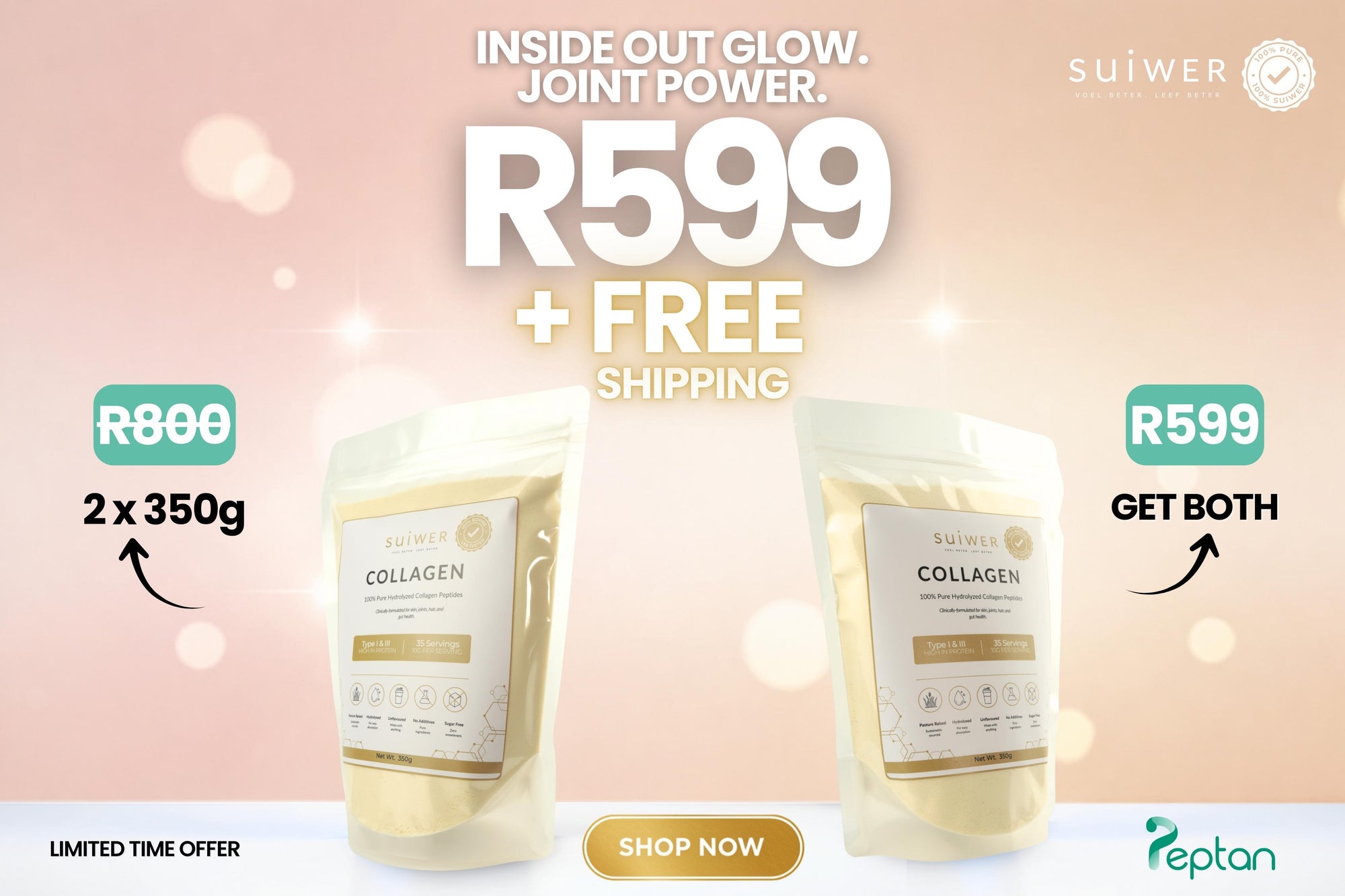 Double up on your daily collagen - Save R200 when you buy two 350g bags at a sale price of R599 AND get Free shipping worth R80.