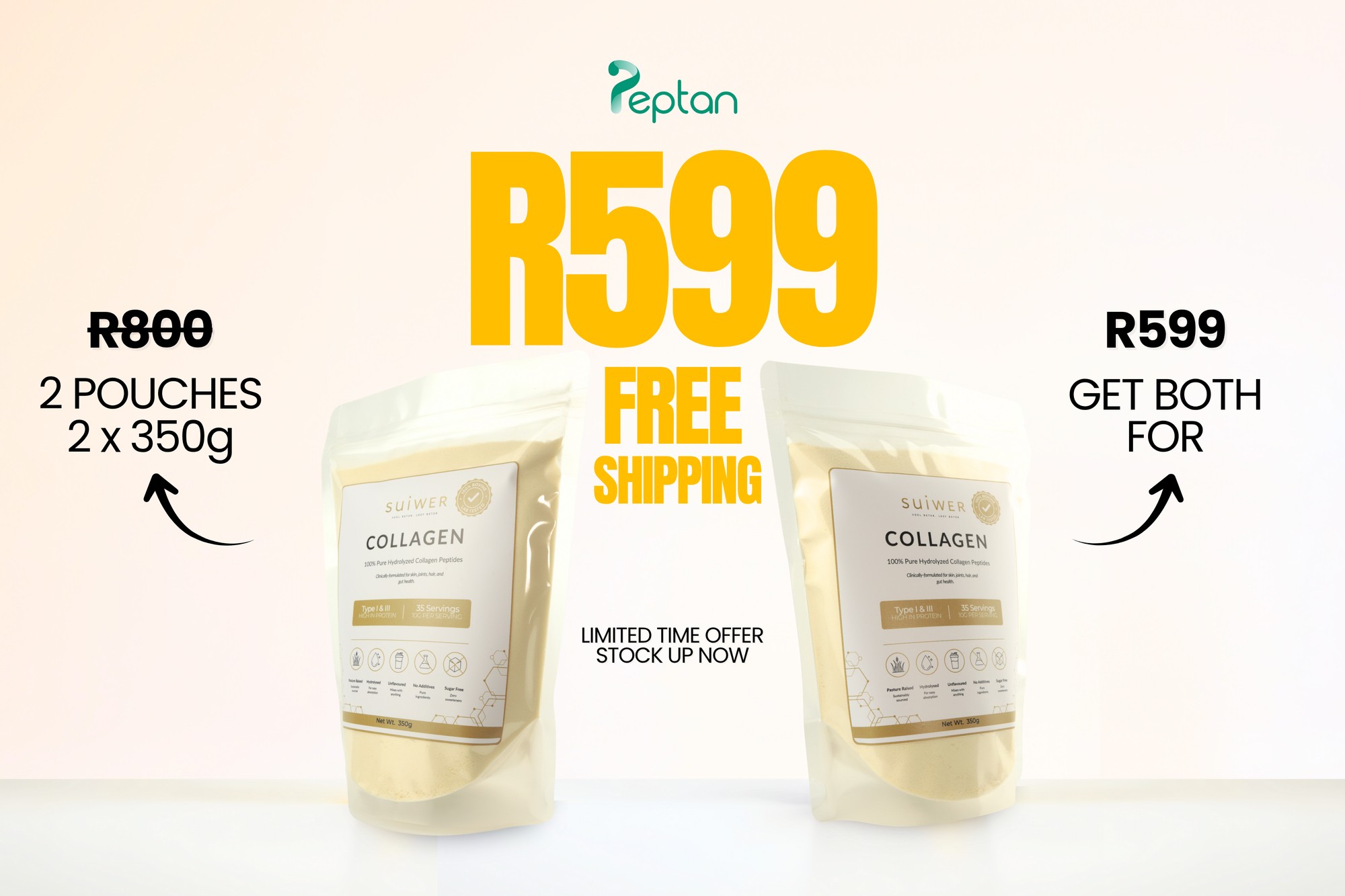 Double up on your daily collagen - Save R100 when you buy two 350g bags at a spring sale price of R599 AND get Free shipping worth R80.