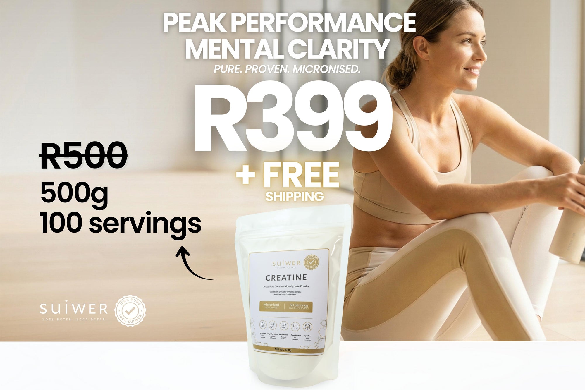 Unleash mental clarity and peak performance with Suiwer's 100% pure, micronized Creatine Monohydrate. Sharpen Your Focus, Conquer Your Day - no fillers, no sugar, no flavouring, and no gimmicks.